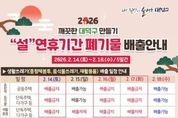 미담타임스 김준완 기자 | 제주시는 설 명절 대비 ‘환경정비 및 생활폐기물 처리대책’을 수립하고, 연휴 기간 예상되는 폐기물 적체와 긴급 상황 등에 신속 대처한다. 2월 14일부터 18일까지 종합상황실을 운영해 가연성·음식물류 폐기물, 재활용품 등 생활폐기물의 안정적인 수거 체계를 구축한다. 또한 읍면동에서도 자체 상황실을 운영해 각종 민원에 효과적으로 대응한다. 특히 설 당일에는 전날 밤 9시부터 익일 새벽 6시까지 청소차량을 가동해 폐기물을 적시에 수거함으로써 시민과 관광객이 쾌적하고 안전한 환경에서 명절을 보낼 수 있도록 할 계획이다. 아울러 2월 13일까지 ‘설 연휴 맞이 범시민 대청결 운동’을 전개한다. 마을안길, 주요 도로, 관광지, 쓰레기 취약지 등을 중심으로 읍면동별 자생단체와 협력해 대대적인 정화 활동을 실시한다. 한편 설 명절 음식 문화 개선 홍보를 통해 음식물류 폐기물 감량을 유도하고, 대형마트를 대상으로는 불필요한 자원 낭비와 폐기물 발생 예방을 위해 과대포장·분리배출 표시 여부를 집중 단속할 예정이다. 홍권성 생활환경과장은 “설 연휴 기간 시민들이 불편함 없이 명