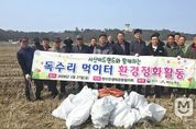 미담타임스 김준완 기자 | 서산시 부석면 창리, 마룡리, 간월도리 등 3개 마을 주민들로 구성된 천수만 생태관광협의회(회장 : 김만석)에서 매년 천수만 독수리 도래지에 대한 정화활동을 실시하고 있다. 서산시에 따르면, 27일 천수만 생태관광협의회 위원과 서산버드랜드 직원 등 20여명은 부석면 창리 독수리 도래지역 정화활동을 통해 고라니 뼈와 쓰레기 등 250kg이 넘는 폐기물을 처리했다고 밝혔다. 독수리 서식지에는 겨우내 서산버드랜드와 생태관광협의회에서 200여 마리의 고라니 폐사체 등을 먹이로 제공하여 뼈와 껍질이 산재해 있었고, 그동안의 강풍으로 인하여 많은 쓰레기가 농경지에 날아든 상황이었다. 천수만 생태관광협의회에서는 지난해부터 지역 주민들이 자체적으로 독수리 먹이터의 청소활동을 시작했으며, 서산버드랜드에서도 적극적으로 동참하면서 연례행사로 이어지고 있다. 김만석 천수만생태관광협의회장은 “지난 겨울 독수리는 우리 지역의 자랑이었다”며, “더 많은 철새들이 우리 지역을 찾아올 수 있도록 주민들의 힘을 모으겠다.”라고 밝혔다. 심영복 서산버드랜드사업소장은 “앞으로도 지역 주민과 함