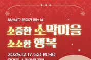 미담타임스 김교환 기자 | 부산 남구는 오는 12월 17일 오후 2시 30분, 우암동 소막마을 주택에서 2025 남구 문화가 있는 날 '소중한 소막마을, 소소한 행복' 공연을 개최한다고 밝혔다. 이번 공연은 역사적 의미가 담긴 소막마을 주택을 지역 문화공간으로 활용하여, 주민들이 일상에서 자연스럽게 문화예술을 접할 수 있도록 마련됐다. 무대는 마술 풍선쇼, 합창, 퓨전국악, 트로트 등 다양한 장르로 구성되어 남녀노소 누구나 부담 없이 즐길 수 있는 무대로 꾸며진다. 특히 소막마을 주택의 아늑한 분위기가 더해져 ‘작지만 소중한 행복’을 나누는 따뜻한 연말 공연이 될 것으로 기대된다. 오은택 남구청장은 “일상 가까이에서 이웃과 함께 문화를 즐기는 경험은 지역 공동체의 정서 교류에 큰 의미가 있다”며 “많은 분이 오셔서 따뜻한 무대와 즐거운 공연을 함께하시길 바란다”고 전했다.