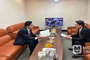 미담타임스 김교환 기자 | 박형준 시장이 12일 오후 국회를 방문해 한병도 예산결산특별위원장, 박형수 예산결산특별위원회 국민의힘 간사, 송언석 국민의힘 원내대표를 잇달아 만나 지역 핵심 사업의 원활한 추진을 위한 국비 지원을 요청했다. 이날 방문에서 박 시장은 항공·항만·반도체·미래차 등 지역 주력산업의 경쟁력 제고를 위해 추진 중인 주요 현안 사업을 중심으로, 내년도 국비가 충분히 반영되어야 한다고 강조했다. 특히, 2026년 정부안에 6,889억 원이 반영된 ▲가덕도 신공항 건설사업(총사업비 15조 6,580억 원)의 경우, 국토교통부가 부지조성공사 공기 조정 등 사업 정상화 방안을 마련 중인 만큼, 예산이 원안대로 유지되어야 2026년 정상적인 사업 추진이 가능하다고 설명했다. 먹는 물 공급 문제와 신산업 기반 확충을 위한 사업들도 집중적으로 건의했다. 시의 오랜 숙원인 ▲낙동강 유역 먹는 물 공급체계 구축사업(총사업비 1조 7,613억 원)이 본격 착수하기 위한 단계인 설계비(19억 2천만 원)의 반영을 요청했다. 아울러, 미음산단을 중심으로 추진되는 ▲차세대 항공 기체부품 첨단제조 실증지원(총사업비 2
