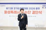 미담타임스 정주환 기자 | 화성특례시의회는 26일 화성종합경기타운 3층 라운지홀에서 열린 제72회 경기도체육대회 화성시 선수단 결단식에 참석해 선수단을 격려하고 4연패 달성을 위한 결의를 다졌다. 이날 행사에는 배정수 의장을 비롯해 김종복 문화복지위원장, 송선영·이용운 의원, 화성시체육회 임원과 종목단체 관계자, 선수단 등 약 150여 명이 참석했다. 이날 결단식은 경기도체육대회 출전을 앞둔 선수단의 사기를 높이고 각오를 다지는 자리로 마련됐다. 화성특례시 선수단은 오는 4월 16일부터 18일까지 광주시 일원에서 열리는 제72회 경기도체육대회에 출전한다. 육상, 수영, 축구 등 27개 종목에 참가해 종합우승 4연패에 도전한다. 배정수 의장은 “묵묵히 쌓아온 훈련의 시간과 노력을 믿고 끝까지 당당하게 경기에 임해주시기 바란다”며 “선수 여러분의 땀과 투혼이 화성특례시의 자부심”이라고 말했다. 이어 “화성특례시의회도 선수들이 오직 경기에 집중할 수 있도록 체육 환경 조성과 지원에 최선을 다하겠다”며 “4연패 달성을 진심으로 기원한다”고 덧붙였다. 화성특례시의회는 선수들이 충분한