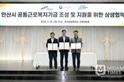 미담타임스 정주환 기자 | 안산시는 지난 26일 안산상공회의소 그레이트홀에서 경기지방고용노동청 안산지청, 안산시 공동근로복지기금 1호 법인과 함께 ‘안산시 공동근로복지기금 조성 및 지원을 위한 상생협약’을 체결했다고 27일 밝혔다. 이번 협약은 지역 중소기업과 노동자가 함께 참여하는 공동근로복지기금 조성을 통해 대·중소기업 간 복지 격차를 완화하고, 상생과 연대의 노동환경을 조성하기 위해 마련됐다. 앞서 시는 지난해 7월 ‘안산시 공동근로복지기금 지원 조례’를 제정하고, 기초자치단체 최초로 공동근로복지기금 지원사업을 시행했다. 이는 지방정부와 중앙정부, 기금법인이 함께하는 3자 협력 모델을 구축했다는 점에서 의미가 있다. 이날 협약식에는 이민근 안산시장을 비롯해 양승철 경기지방고용노동청 안산지청장과 장현준 기금법인 대표, 참여기업 관계자 등 100여 명이 참석한 가운데 공동근로복지기금 사업 출범을 기념하고 상생 협력 의지를 다졌다. 협약에 따라 안산시는 공동근로복지기금 조성 및 운영을 위한 행정·재정적 지원을 담당하고, 경기지방고용노동청 안산지청은 ▲정책 반영과 제도 개선 ▲참여기업 확대 및 우수사