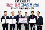 미담타임스 김준완 기자 | 경산시는 17일 국회 본관 소회의실에서 조지연·권영진 국회의원, 조현일 경산시장, 김학홍 경북도 행정부지사, 안효대 울산시 경제부시장 등 관계 지자체 및 국회 관계자 20여 명이 참석한 가운데 경산~울산 고속도로 신설의 국가 계획 반영을 건의하며, 범시민 서명부와 3개 지자체장의 공동선언문을 국토교통부에 공식 전달했다. 이날 경산시는 경산~울산 고속도로 신설을 촉구하는 범시민 서명부(160,123명)와 함께, 경북도·울산시·경산시가 공동으로 뜻을 모은 선언문을 전달하며, 김윤덕 국토부 장관에게 사업의 필요성과 제3차 고속도로 건설계획 반영을 요청했다. 이와 함께 권영진 국회의원도 함께 참석하여 뜻을 모았다. 경산~울산 고속도로는 영남 내륙과 동남권 산업권을 직접 연결하는 핵심 교통축으로, 이동 거리 단축과 물류 효율성 제고를 통해 지역 간 산업 연계 강화와 초광역 경제권 형성에 기여할 것으로 기대되고 있다. 특히 자동차부품 산업이 집적된 경산과 완성차 산업의 중심지인 울산을 직결함으로써, 기존 우회·경유 구조로 인한 물류 비효율을 개선하는 기반이 될 수 있다는 평가다. 이