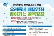 미담타임스 김교환 기자 | 기장군은 오는 2월 9일부터 12일까지 ‘상반기 우리동네 배달강좌 및 찾아가는 골목강좌’ 수강생을 모집한다고 6일 밝혔다. ‘우리동네 배달강좌’란 학습자가 원하는 시간과 장소에 강좌를 배달하는 평생학습 프로그램이며 ‘찾아가는 골목강좌’는 우리동네 배달강좌의 일환으로, 소외계층을 대상으로 운영되는 평생학습 프로그램이다. 이번 강좌는 ▲교육·학문 ▲어학 ▲건강 ▲음악 ▲미술·공예 ▲컴퓨터·통신 ▲가정·생활 분야 총 60강좌를 모집한다. 수업은 3월 23일부터 5월 29일까지 10주간 운영되며, 대면 수업과 함께 ZOOM 등 온라인 플랫폼을 활용한 비대면 수업을 병행해 학습 편의성과 접근성을 높일 예정이다. 신청대상은 19세 이상 기장군민으로, 대면 강좌는 10인 이상, 비대면 강좌는 7인 이상 학습자를 구성하여 강좌를 신청할 수 있다. 골목강좌는 7인 이상의 학습소외계층(▲기초생활수급자 ▲차상위계층 ▲장애인 ▲다문화·한부모·다자녀가정 ▲남성수강생 ▲직장인)으로만 구성되어야 신청이 가능하다. 신청방법은 기장군 평생학습 홈페이지에서 강사현황을 참고하여 배달강사를 선택한 후 수강생