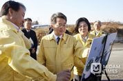 미담타임스 정주환 기자 | 28일 안성에서 19번째 민생경제 현장투어에 나선 김동연 경기도지사가 경기도 최남단 안성의 거점소독시설을 찾아 초동 방역 상황을 긴급 점검했다. 이번 점검은 지난 25일 충남 당진에서 발생한 아프리카돼지열병에 대한 선제적 방역 조치의 하나로 마련됐다. 김 지사는 현장에서 터널식 소독조에서 진행되는 가축 방역 과정을 지켜본 후 관계자들을 격려하고 겨울철 동물방역에 최선을 다해줄 것을 당부했다. 김 지사는 “조류인플루엔자와 아프리카돼지열병이 계속 전파 중이어서 걱정이다. 경기도는 빠른 대응, 강력한 방역, 신속한 지원의 3대 원칙으로 동물방역에 대처하겠다”며 “축산농가 보호와 축산업 발전을 위해 최선을 다하겠다. 축산농가 종사자 여러분들도 방역과 예방에 협조를 부탁드린다”고 강조했다. 돼지 33만 두를 사육하는 안성(도내 2위, 전국 4위)은 평택·화성과 근접한 돼지 사육 중심지다. 경기도는 방역대 설정, 이동 제한 등 광범위한 방역 조치를 시행하고 있다. 현장에서 김보라 안성시장, 윤종군 국회의원과 즉석 스탠딩 간담회 가져 소독시설 점검을 마친 김동