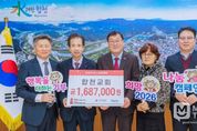 미담타임스 김교환 기자 | 합천군은 6일, 합천읍에 소재한 합천교회(목사 김대근)가 합천군청을 방문해 이웃돕기 성금 1,687,000원을 기탁했다고 밝혔다. 이번 기탁은 지역 사회의 복지 향상과 이웃 사랑의 실천을 위한 ‘이웃돕기 바자회’에서 발생한 수익금으로, 이번 기탁식에는 김대근 목사를 비롯해 심재수 장로와 김영희 권사가 참석하여 따뜻한 마음을 나누었다. 김대근 목사는 “우리 주변의 모든 이웃들이 더욱 건강하고 행복한 삶을 살 수 있기를 기도하는 마음으로 성금을 전달하게 됐다”며 “앞으로도 다양한 방법으로 주변 이웃들을 돕는 활동을 꾸준히 이어나가겠다"고 말했다. 김윤철 합천군수는 "이웃을 위하는 따뜻한 마음으로 나눔을 실천해주셔서 감사드리며, 소중한 성금은 꼭 필요한 이웃에게 전달될 수 있도록 하겠다"고 말했다. 한편 합천군은 2025년 12월 1일부터 2026년 1월 31일까지 희망2026나눔캠페인 이웃돕기 성금 집중 모금 기간을 운영하고 있다. 기탁받은 성금은 경남사회복지공동모금회를 통해 관내 어려운 이웃에 지원할 계획이다. 성금 기탁을 희망하는 분들은 합천군청