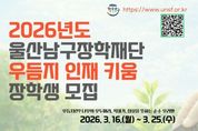 미담타임스 김준완 기자 | (재)울산광역시남구장학재단은 재능과 잠재력을 가진 청소년을 발굴해 남구를 대표하는 인재로 성장시키기 위한 ‘2026년 우듬지 인재 키움 사업’ 장학생을 모집한다. ‘우듬지’는 나무의 꼭대기 줄기이자 정상을 의미하는 순우리말로 남구의 미래를 이끌 최고 인재로 성장하길 바라는 의미를 담아 지난해 처음 시행한 남구장학재단의 대표 인재 육성 사업이다. 장학금 지원뿐만 아니라 봉사활동, 재능기부, 멘토링 등 지역사회 환원 활동을 통해 지역 인재의 성장과 나눔이 이어지는 선순환 구조를 만들어 가는 것을 목표로 하고 있다. 2025년에는 수학·과학 등 미래 분야와 음악·미술·체육 등 예체능 분야에서 15명의 장학생을 선발해 지원했고 올해는 기존 장학생 지원을 이어가면서 신규 장학생 17명을 추가 선발해 총 30명의 지역 인재에게 장학금을 지원할 계획이다. 선발 분야는 미래리더(수학·과학)와 예체능리더(음악·미술·체육)로 재능과 성장 가능성을 갖춘 중·고등학생, 대학생, 학교 밖 청소년을 대상으로 선발한다. 지원자는 공고일 기준 울산 남구에 1년 이상 거주하고 남구 소재