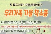 미담타임스 김교환 기자 | 대구두류도서관은 10월 18일부터 31일까지 어린이실에서 선착순 40가족을 대상으로 책과 소풍 물품을 함께 대여하면 머리띠와 퍼즐을 증정하는‘우리가족 가을 책소풍’행사를 실시한다. 참여를 원하는 가족은 어린이실에 방문하여 도서관 회원증을 제시하고 책과 돗자리, 간이의자, 미니테이블, 독후활동지, 보드게임 등 소풍에 필요한 물품을 대여하고 당일 오후 5시까지 반납하면 된다. 기타 자세한 내용은 도서관 누리집 또는 어린이실로 문의하면 된다.