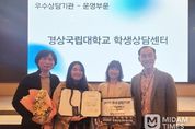 미담타임스 김교환 기자 | 경상국립대학교(GNU·총장 권진회) 학생상담센터(센터장 김장회 교육학과 교수)가 전국대학교학생상담센터협의회(전상협)가 주관한 ‘2025년 우수상담기관’에 선정됐다. 이번 선정은 경상국립대학교 학생상담센터가 심리·진로·학습을 아우르는 통합 학생상담 체계를 구축하고, 예방·개입·연계·환류에 이르는 전 과정을 체계적으로 운영하여 재학생의 학교생활을 지원한 노력을 높게 평가한 결과이다. 전국 300여 개 대학의 학생상담센터가 회원으로 등록하여 활동하는 전상협은 매년 12월 개최하는 연차학술대회에서 최근 4년간 가장 모범적으로 운영한 상담센터를 선발하여 우수상담기관으로 인정하고 시상한다. 경상국립대학교 학생상담센터는 2016년 개소 이후 상담 인력 확충, 시스템 고도화, 프로그램 다양화 등 대학 생활 전 주기를 고려한 통합상담 서비스를 제공해 왔다. 특히, 신입생 마음건강 전수조사, 학사경고자 상담, 지도교수 연계 상담, 프렌카운슬러 양성, 찾아가는 상담 등 학생 요구에 기반한 다층적 지원 체계를 마련함으로써 재학생들의 학교 적응과 심리·정서적 안정에 실질적인 도움을 주었다는 평가를 받고 있다