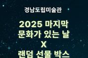 미담타임스 김교환 기자 | 경남도립미술관은 12월 31일 ‘문화가 있는 날’을 맞이해 연말을 함께 즐길 수 있는 특별 이벤트를 마련한다고 밝혔다. 이날 미술관은 전시실을 무료 개방하며, 관람 시간 또한 오후 8시까지 연장 운영된다. 오후 6시부터는 미술관을 찾은 관람객 중 선착순 30명에게 참여 기회가 주어지는 ‘행운권 추첨 이벤트’가 진행되며, 참여자에게는 랜덤 선물 박스 등 다양한 경품이 증정된다. 이번 행사는 ‘문화가 있는 날’을 통해 관람객이 미술관을 보다 가깝게 느끼고, 한 해를 예술과 함께 마무리할 수 있도록 기획됐다. 미술관 관계자는 “2025년을 함께 해준 지역민들에게 감사의 마음을 전하며, 작은 선물과 예술의 경험이 따뜻한 연말 추억이 되길 바란다”라고 전했다. 한편, 이번 야간 개장에서는 현재 진행 중인 환경을 주제로 한 체험형 전시《테라폴리스를 찾아서》와 함께《현대옻칠예술: 겹겹의 시간》도 관람가능하다.