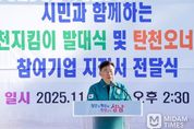 미담타임스 정주환 기자 | 신상진 성남시장은 12일 오후 2시 30분 탄천변에서 열린 ‘명품 탄천지킴이 발대식’에 참석했다. 민·관·기업 협력을 통한 지속가능한 탄천 관리 체계 구축을 위해 마련된 이번 발대식에는 신 시장을 비롯해 ESG활성화위원회 관계자, ESG 참여기업 관계자, 명품탄천지킴이 등 300여 명이 함께했다. 이날 행사는 환경지킴이 50명에 대한 위촉장 수여, KT 및 한화비전 ESG 탄천오너십 기업 지정서 전달, 시장 인사말, 기념촬영, 탄천 정화활동 순으로 진행됐다. 신 시장은 인사말을 통해 “시민들의 소중한 휴식처를 관리하고 가꾸는 일은 행정의 힘만으로는 불가능하다”며 “여러분과 함께 탄천을 지키기 위해 오늘 발대식을 마련했다”고 말했다. 이어 “시장 취임 후 탄천 전 구간의 퇴적토를 단계적으로 준설해 유량 흐름을 원활히 하고 수질을 개선했다”며 “앞으로도 지킴이 여러분과 함께 시민들이 휴식하고 다양한 생활체육을 즐길 수 있는 우리 모두의 명품 탄천으로 가꿔나가겠다”고 강조했다. 성남시는 지난 9월 ‘ESG 특별시 성남’ 비전을 선포하고, 탄천 정화 활동을 포함한 E