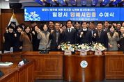 미담타임스 김교환 기자 | 경남 밀양시는 15일 시청 소회의실에서 밀양시 발전에 기여한 전·현직 부시장 3명에게 명예시민증을 수여했다. 밀양시 명예시민증은 우방국가 또는 다른 지방자치단체의 주민으로서 밀양시정에 공로가 현저하거나 밀양시를 방문하는 귀빈에게 수여하는 증서로, 밀양시 부시장을 역임한 27대, 28대, 29대 부시장에게 수여됐다. 수여 대상자는 △27대 밀양시 부시장 김성규(현 경상남도 교육청년국장) △28대 밀양시 부시장 허동식(현 부산진해경제자유구역청 개발본부장) △29대 밀양시 부시장 곽근석(현 밀양시 부시장)이다. 수여 대상자들은 재임 기간 동안 시정의 주요 현안을 해결하며 밀양시의 다양한 정책을 이끌어 지역의 경제적, 사회적 발전에 기여해 왔다. 특히, 나노융합국가산업단지 조성 및 기업유치 기반 강화, 창녕~밀양 간 고속도로 개통, 김해~밀양 고속도로 건설 추진 등 지역경제 활력을 위한 기반 마련에 공통적으로 힘써왔다. 아울러 스마트 선도 농업을 통한 활기찬 밀양 조성, 머물고 싶고 다시 찾는 밀양을 만들기 위한 다양한 정책을 추진하며 품격 있는 문화·관광 도시 조성