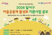 미담타임스 김교환 기자 | 대구 달서구는 주민이 스스로 마을에 필요한 사업을 발굴하고 실행하는 ‘2026년 마을공동체 활성화 지원사업’ 참여자를 2월 13일까지 모집한다. 올해로 7년째를 맞는 달서구 마을공동체 활성화 지원사업은 2020년부터 현재까지 총 79건의 사업을 지원해 왔으며, 탄소중립 실천, 공동텃밭, 공동육아, 소외계층 돌봄, 마을축제 등 다양한 분야에서 주민 주도의 마을문제 해결과 공동체 기반 확충에 기여하고 있다. 이번 공모는 총 3개 분야로 15개팀 내외를 선정해 공동체 역량과 사업 성격에 따라 단계별로 사업비를 지원한다. 지원 규모는 ▲ 신규 공동체를 위한 ‘신참마을’ 200만원 이내 ▲ 경험 있는 공동체를 위한 ‘도약마을’ 300만원 이내 ▲ 마을축제 등을 위한 ‘주민화합행사’ 500만원 이내이다. 신청 자격은 5인 이상 달서구 주민 모임 또는 단체이며, ‘주민화합행사’는 10인 이상이 참여해야 한다. 또한 교육·환경·복지·안전·문화 등 마을에 필요한 다양한 분야에서 다수 주민이 공감하고 함께 참여할 수 있는 공익성 사업이어야 한다. 신청 서식과 자세