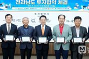 미담타임스 정인화 기자 | 전라남도는 24일 도청 서재필실에서 ㈜성경식품, ㈜해진수산, ㈜해진식품 등 3개사와 투자금액 총 1천34억 원 규모의 투자협약을 했다고 밝혔다. 이번 투자로 302명의 신규 고용 창출도 기대된다. 이날 협약식에는 김영록 전남도지사를 비롯해 육현진 ㈜성경식품 대표, 김성윤 ㈜거해 대표, 임한택 ㈜해진수산·㈜해진식품 대표, 김희수 진도군수, 윤재광 영암부군수 등이 참석했다. ㈜성경식품은 자반김 전문업체 ㈜거해와 합작해 500억 원을 투자, 진도 군내농공단지에 생산시설을 구축한다. 최첨단 설비와 스마트 자동화 공정을 도입해 강화된 글로벌 위생 기준에 대응해 진도공장을 글로벌 수출 전진기지로 육성할 계획이다. 향후 조미김 등 완제품 가공 분야까지 투자 범위를 확대해 김 산업의 부가가치를 높여갈 예정이다. ㈜해진수산과 ㈜해진식품은 534억 원을 투입, 영암군에 마른김·조미김 생산라인을 구축한다. 해남에서 레미콘 기업을 운영해 온 임한택 대표의 식품산업 진출 사례로, 지역 내 식품 분야 투자 다각화를 촉진하는 모범 모델이 될 것으로 주목된다. 전