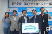 미담타임스 김교환 기자 | 부산 동구, 동구종합사회복지관은 근로복지공단 부산지역본부에서 10월 1일 추석 명절을 앞두고, 동구 지역 소외계층에게 힘이 될 수 있도록 50만 원의 후원금을 동구종합사회복지관에 전달했다고 밝혔다. 해당 성금은 동구 지역 내 취약계층의 추석 명절맞이 지원으로 활용될 예정이다. 이외에도 근로복지공단 부산지역본부에서는 임직원들이 매주 수요일마다 복지관 4층 장난감도서관을 방문해 어린아이들이 안전하게 놀 수 있도록 장난감 소독 봉사활동에 꾸준히 참여하고 있다. 민병창 근로복지공단 부산지역본부장은 “어른, 아이 할 것 없이 모두가 행복하고 즐거운 동구가 될 수 있도록 앞으로도 다양한 활동을 통해 사회공헌사업을 이어나가겠다” 고 밝혔다.