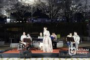 미담타임스 김준완 기자 | 제64회 경북도민체육대회 개최를 기념해 예천군이 마련한 ‘개심사지 벚꽃 버스킹’이 4월 4일과 5일 이틀간 예천읍 개심사지 오층석탑 일원에서 성황리에 열렸다. 만개한 벚꽃이 조명을 받아 밝게 빛나는 야경 속에서 오후 7시부터 8시까지 진행된 이번 공연에는 연일 수백 명의 주민과 관광객이 몰렸다. 관람객들은 빈백 의자에 앉아 봄 저녁의 여유를 즐기며 공연을 감상했다. 행사장에는 대형 달 조형물과 토끼 조형물이 설치되고, 잔디밭을 따라 물결처럼 이어진 전구 스트링 조명이 공간을 은은하게 밝히며 개심사지 일대를 감성적인 분위기로 연출했다. 이번 공연에는 국내 1세대 퓨전 국악 밴드 ‘프로젝트 락’이 출연해 해금·피리·대금 등 전통 국악기와 밴드 사운드를 결합한 독창적인 무대를 선보였다. 첫날 ‘화연(花宴), 봄을 열다’ 공연은 한복을 입은 보컬의 판소리와 현대적 가창이 벚꽃 야경과 어우러져 잔잔한 감동을 전했고, 둘째 날 ‘풍류난장(風流亂場), 흥을 깨우다’ 무대는 관객 참여와 즉흥 연주를 통해 활기찬 분위기를 이끌어냈다. 행사장에는 도민체전을 찾은 타 시·군 방문