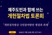미담타임스 정인화 기자 | 제주특별자치도의회, 제주특별자치도 주민자치위원회협의회, 제주대학교 리걸클리닉센터, 제주미래디자인포럼, 사회적협동조합 제주로 공동 주최로 11월 25일 오전 10시, 제주특별자치도의회 1층 대회의실에서 '제주도민과 함께 쓰는 개헌절차법 토론회'를 개최한다. 국민주권 시대에 국민이 주도하는 헌법 개정 요구가 커지고 있고 이에 시민의회 방안, 국민청원 방안, 추진협의회 방안 등 국민참여방안을 담은 개헌절차법안이 3건이 국회에 발의됐지만 3건 법안의 국민참여방안은 제주도민의 의견을 충분히 반영하기에는 미흡하다는 지적이 있음에따라 이번 토론회는 제주도민의 목소리가 실질적으로 담길 수 있는 개헌절차법 제정 방안을 깊이 있게 모색하기 위해 마련됐다. 토론회는 이상봉 제주특별자치도의회 의장의 인사말로 시작하여 이남근 제주특별자치도의회 의원이 좌장을 맡고 신용인 제주대학교 로스쿨 교수가 '개헌절차법상 국민참여 방안 쟁점과 과제'를 주제로 발표할 예정이다. 또한 고정학 제주특별자치도주민자치위원회협의회장, 신훈민 변호사, 양광수 아라동 주민자치위원장, 조현주 국민주도상생개헌행동 상임공동대표가 제주도민의